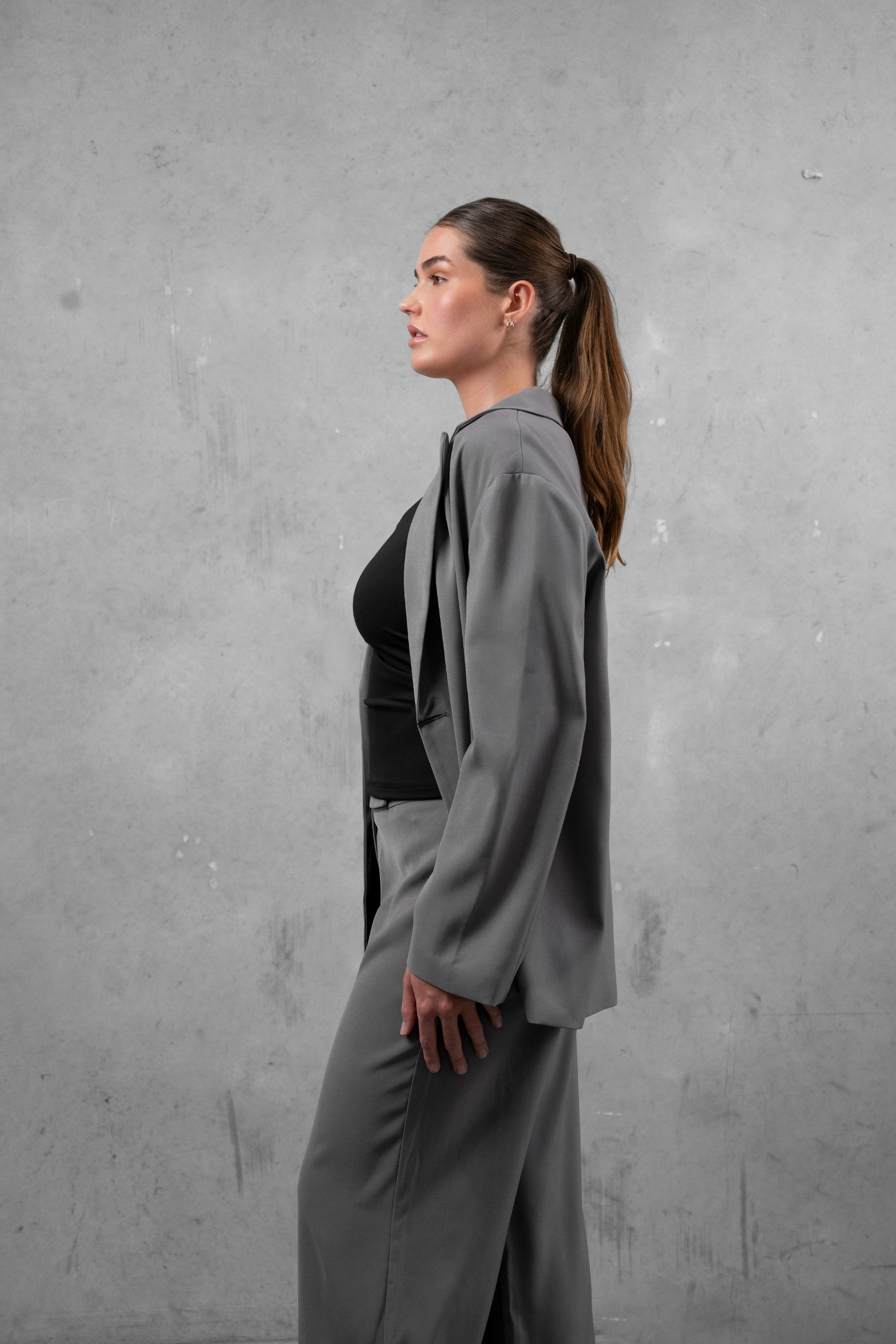 A modern uniform essential. The Patch Blazer reimagines classic tailoring with a relaxed, oversized silhouette and drop-shoulder design. Cut from structured suiting fabric, it features clean lines, a notched lapel, and a two-button closure that layers effortlessly over any look.