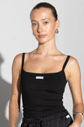 Whether worn solo or layered under the Brynn Blazer, this tank fits close to the body and pairs with everything. Available in black or white for effortless styling.