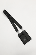 Fabric: Nylon/Polyester strap with vegan leather details and silver hardware. Vegan leather glove holder attachment and vegan leather gloves.