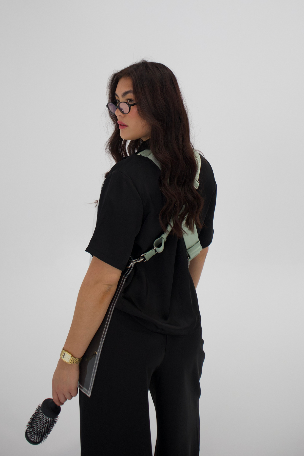 To preserve the look of the vegan leather, do not scrub or use abrasive cleaners. When caring for the hardware, a soft dry cloth can be used to gently polish and clean the silver.